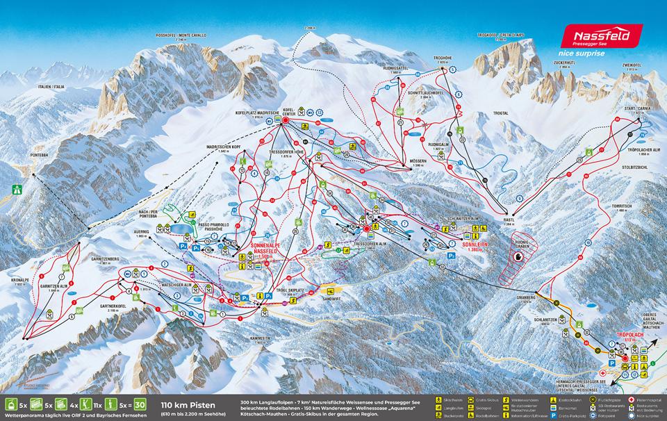Wie de pistes van de Madritsche, Troghöhe, Start Carnia en Gmanberg afwisselt maakt een behoorlijke skironde! Snowboarders vinden bij de Tressdorferalm een funpark en bij de Watschiger Alm een halfpipe. De Skiarena Kärnten Nassfeld-Hermagor is een veelzijdig skigebied met afwisselende pistes die geschikt zijn voor iedere doorsnee skiër.